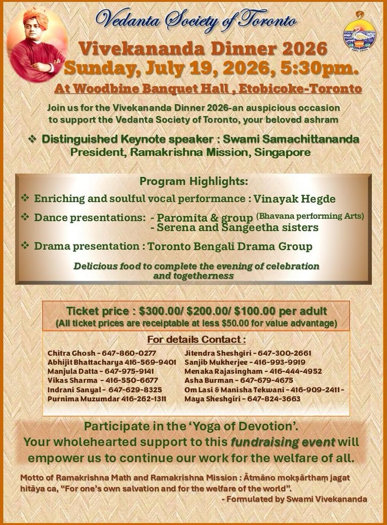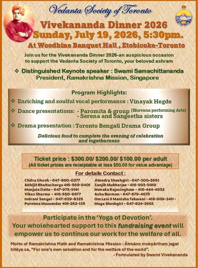 The Vedanta Society of Toronto is currently on Winter break and will reopen on March 25, 2026. The Ashram is open for devotees ONLY for Aratrikam every evening from 5:30 to 7:00 PM.